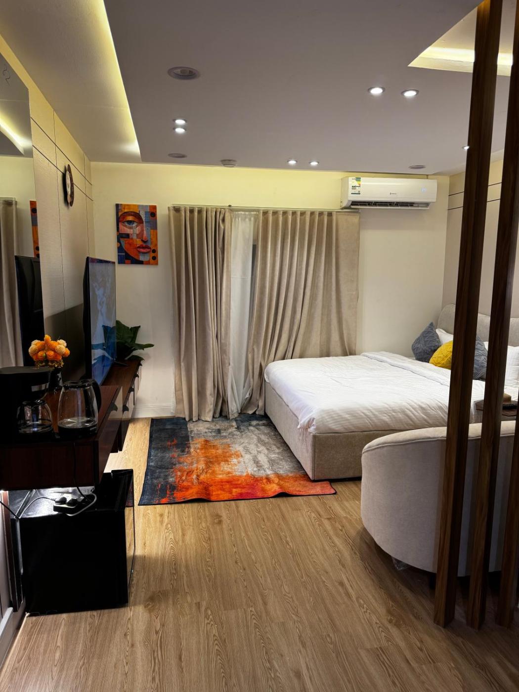 One-Bedroom Apartment. The air-conditioned apartment has 1 bedroom, 1 bathroom, a kitchen and a seating area. The apartments kitchen is available for cooking and storing food. The apartment features a minibar, a carpeted floor, heating, as well as a flat-screen TV. The unit has 1 bed.